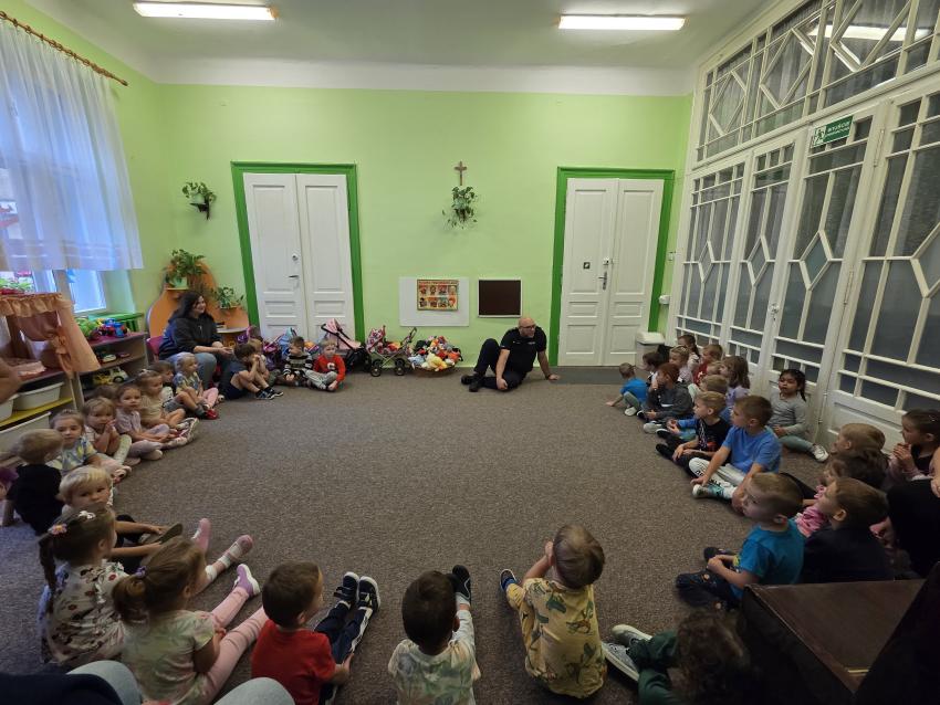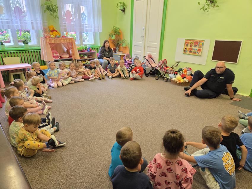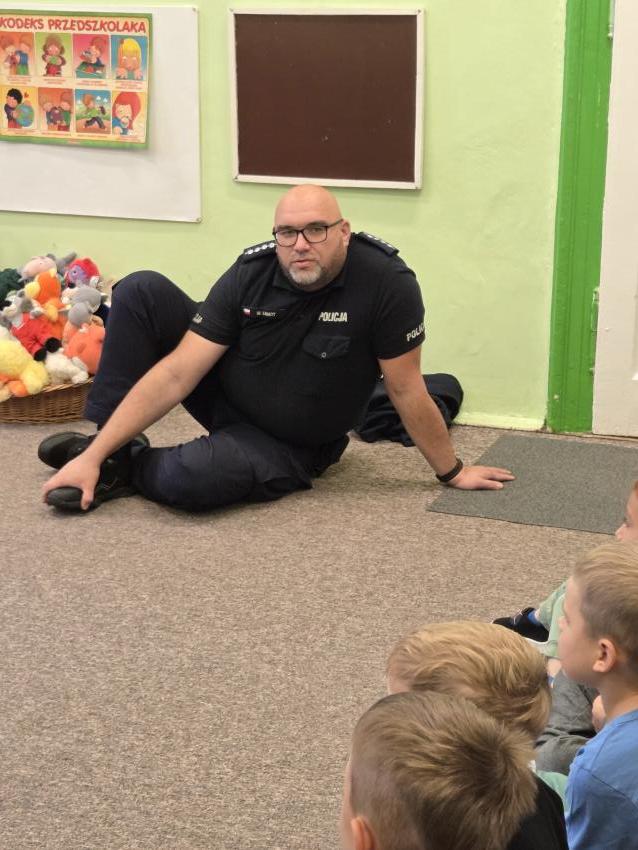 16.09.2025 nasze przedszkole odwiedził Policjant, który rozmawiał z dziećmi na temat bezpieczeństwa w ruchu drogowym, kontaktach z innymi osobami. Dzieci utrwaliły sobie numery alarmowe. Rozmawialiśmy jak ważną rolę spełniają elementy odblaskowe.
