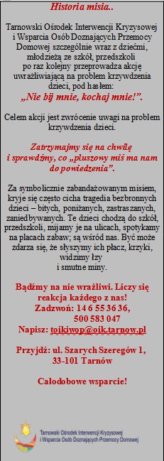 Już kolejny raz dzieci z naszego przedszkola uczestniczyły w akcji organizowanej przez Tarnowski Ośrodek Interwencji Kryzysowej i Wsparcia Osób Doznających Przemocy Domowej w ramach ogólnopolskiej kampanii Fundacji Dajemy Dzieciom Siłę " Dzieciństwo bez przemocy". Celem akcji jest uwrażliwienie społeczeństwa na przemoc wobec dzieci i zachęcanie do reagowania.Nie możemy pozostawać obojętni!