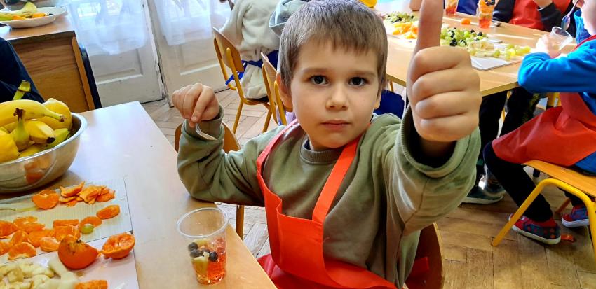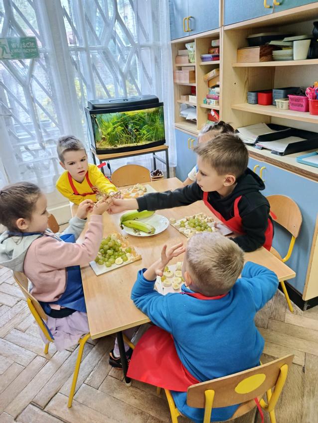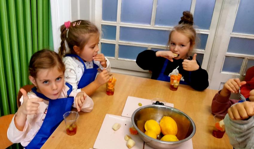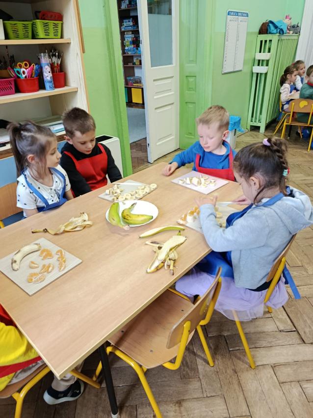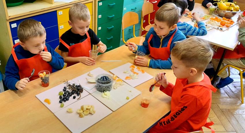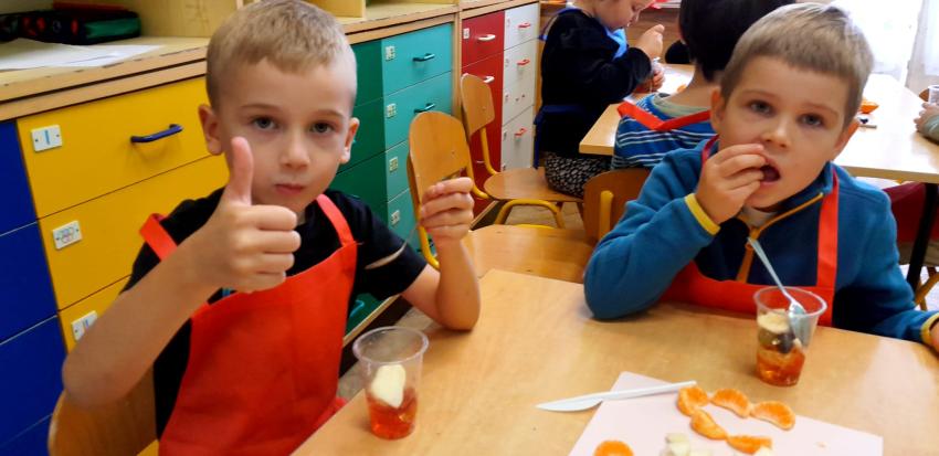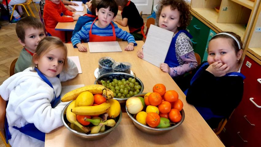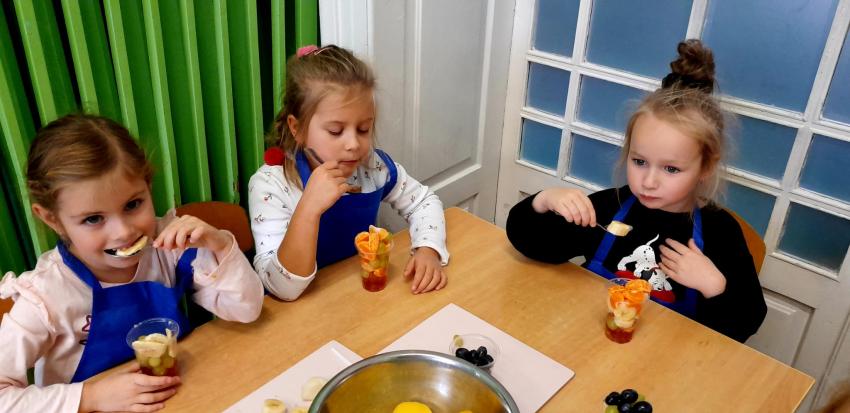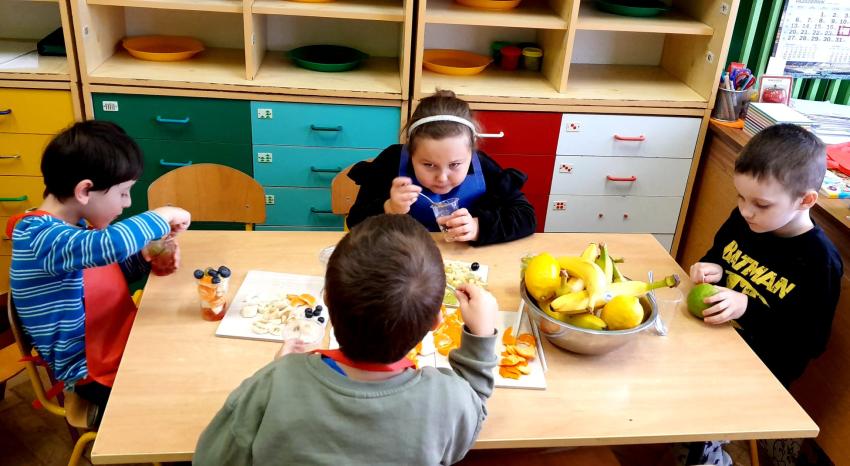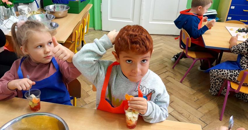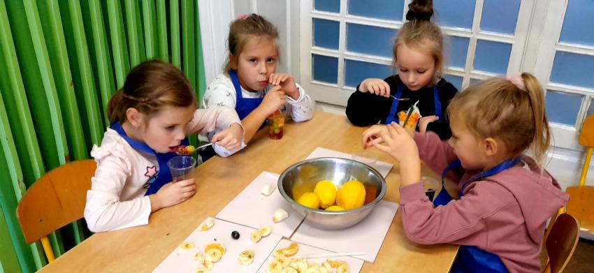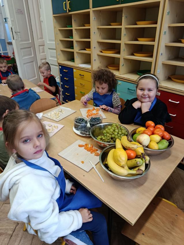 W naszym przedszkolu święto związane z dniem warzyw i owoców poprzedzone było cyklem zajęć edukacyjnych, realizacją zajęć w ramach programu " Skąd się biorą produkty ekologiczne" na temat zdrowego odżywiania. Głównym celem było zachęcenie dzieci do spożywania warzyw i owoców. Dzieci uczestniczyły w warsztatach kulinarnych przygotowując słodką przekąskę. Przedszkolaki w mgnieniu oka zjadły owocową przekąskę. Zachęcamy wszystkich do codziennego spożywania warzyw i owoców nie tylko od święta.