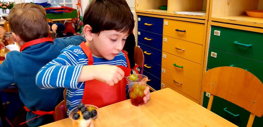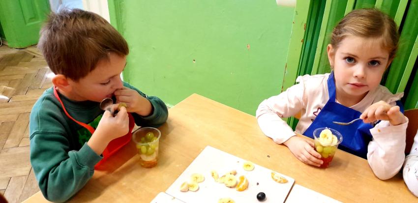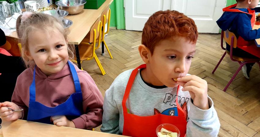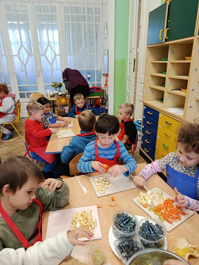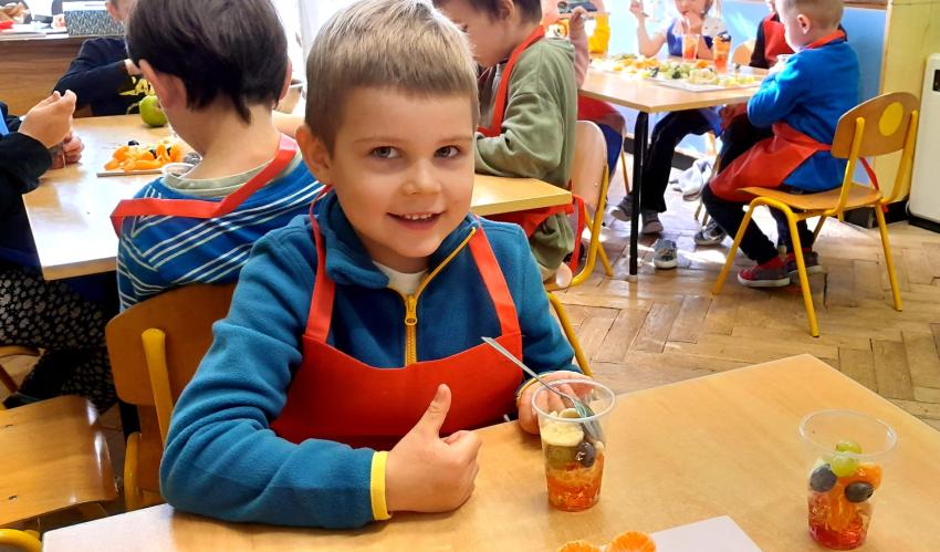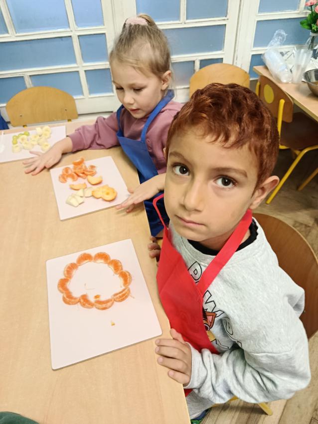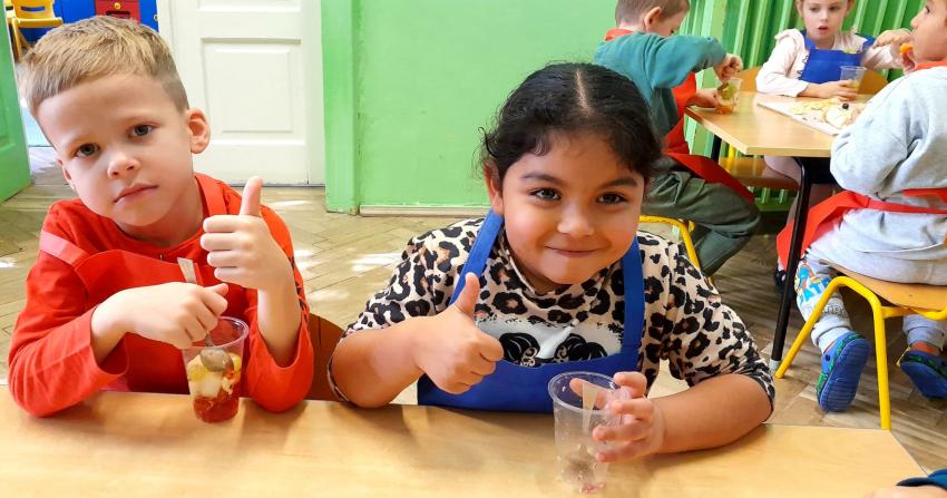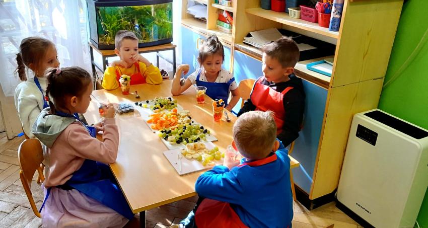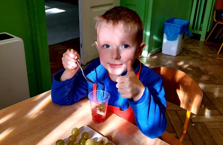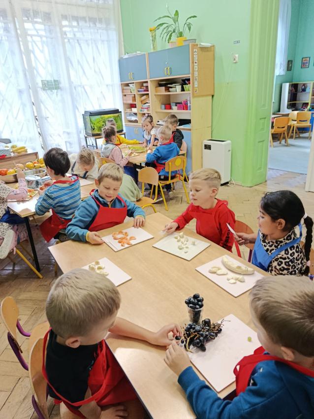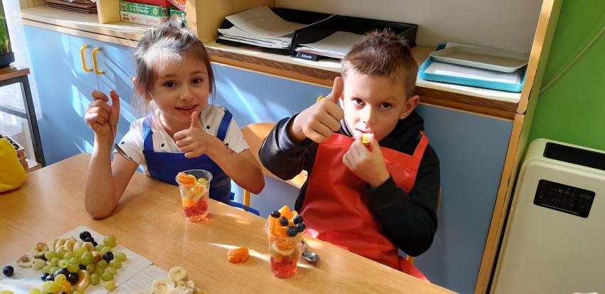 W naszym przedszkolu święto związane z dniem warzyw i owoców poprzedzone było cyklem zajęć edukacyjnych, realizacją zajęć w ramach programu " Skąd się biorą produkty ekologiczne" na temat zdrowego odżywiania. Głównym celem było zachęcenie dzieci do spożywania warzyw i owoców. Dzieci uczestniczyły w warsztatach kulinarnych przygotowując słodką przekąskę. Przedszkolaki w mgnieniu oka zjadły owocową przekąskę. Zachęcamy wszystkich do codziennego spożywania warzyw i owoców nie tylko od święta.