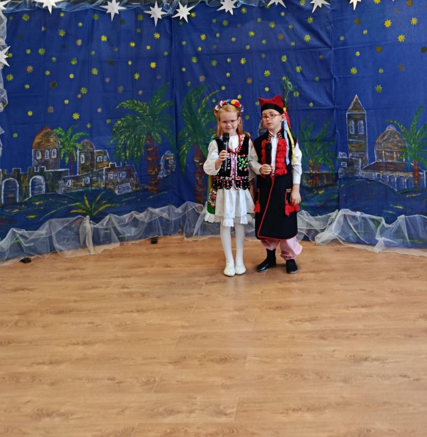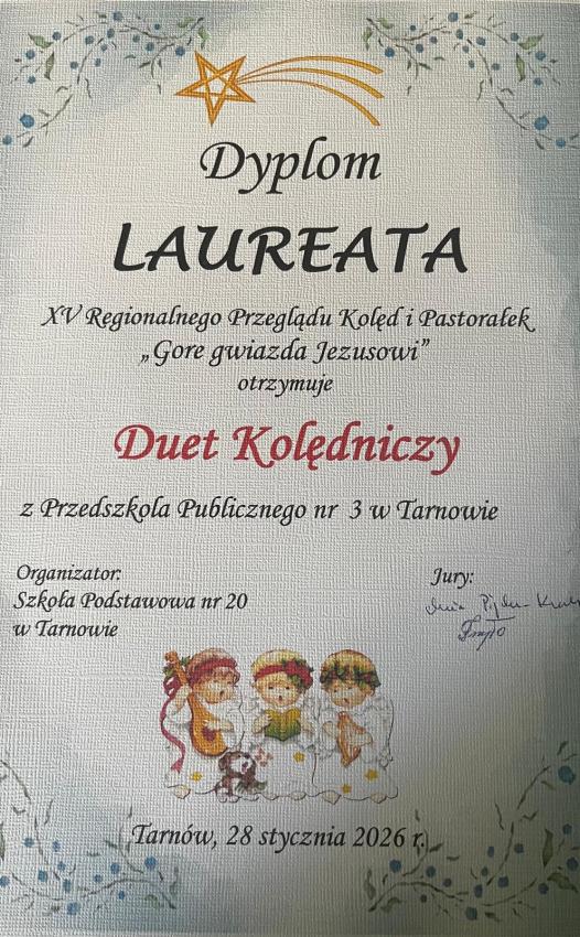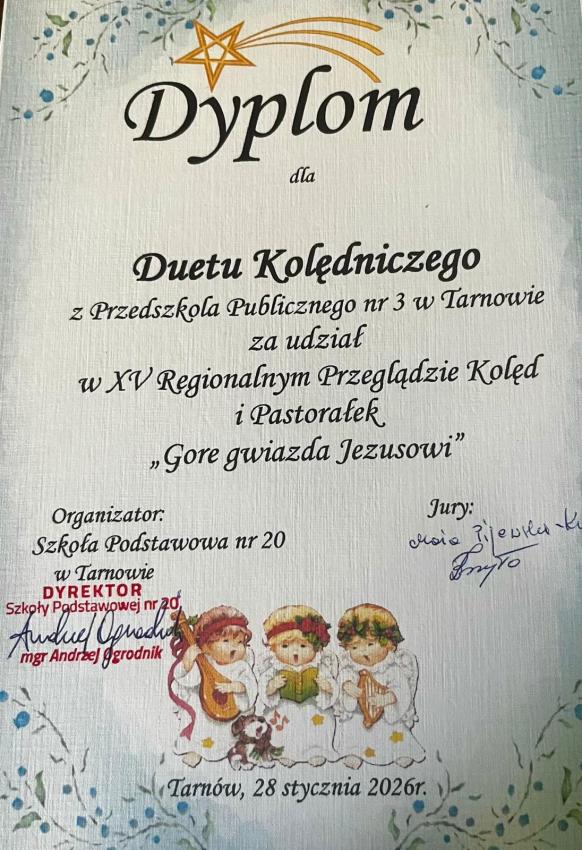 W dniu 28.01.2026 sukces naszych przedszkolaków w XV Regionalnym Konkursie Kolęd i Pastorałek " Gore gwiazda Jezusowi". Organizatorem konkursu była Szkoła Podstawowa Nr 20 z Oddziałami Sportowymi. Nasz Duet Kolędniczy w składzie Julia i Kamil zajęli I miejsce. Laureatom konkursu serdecznie gratulujemy.