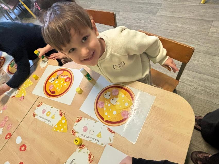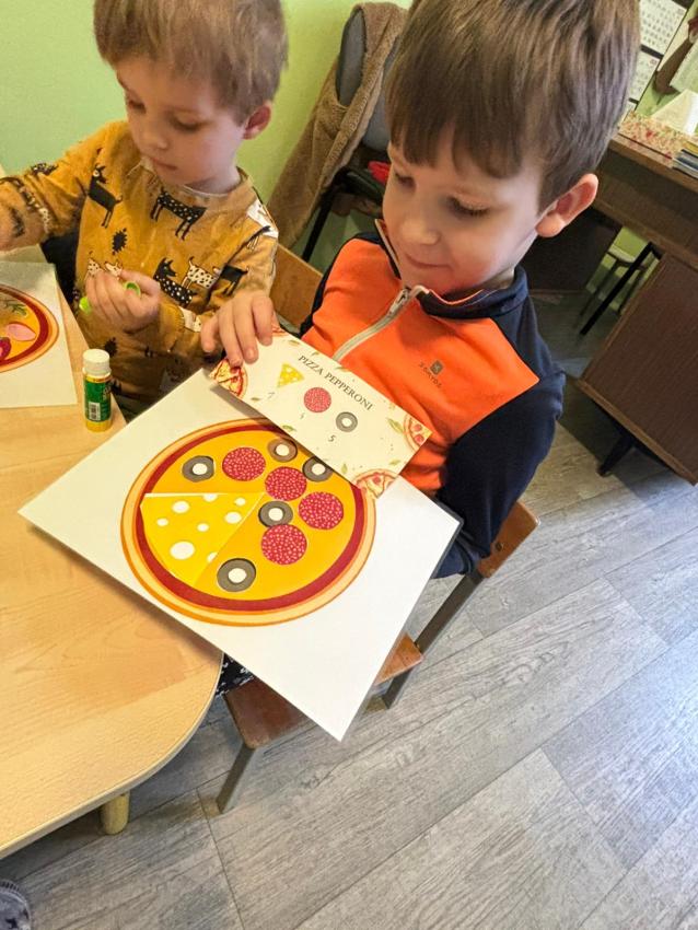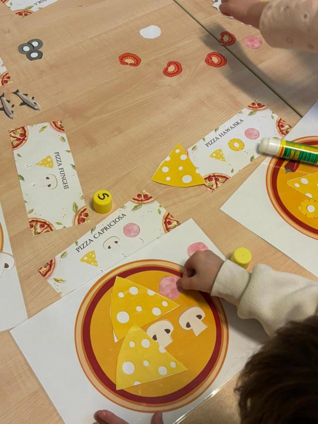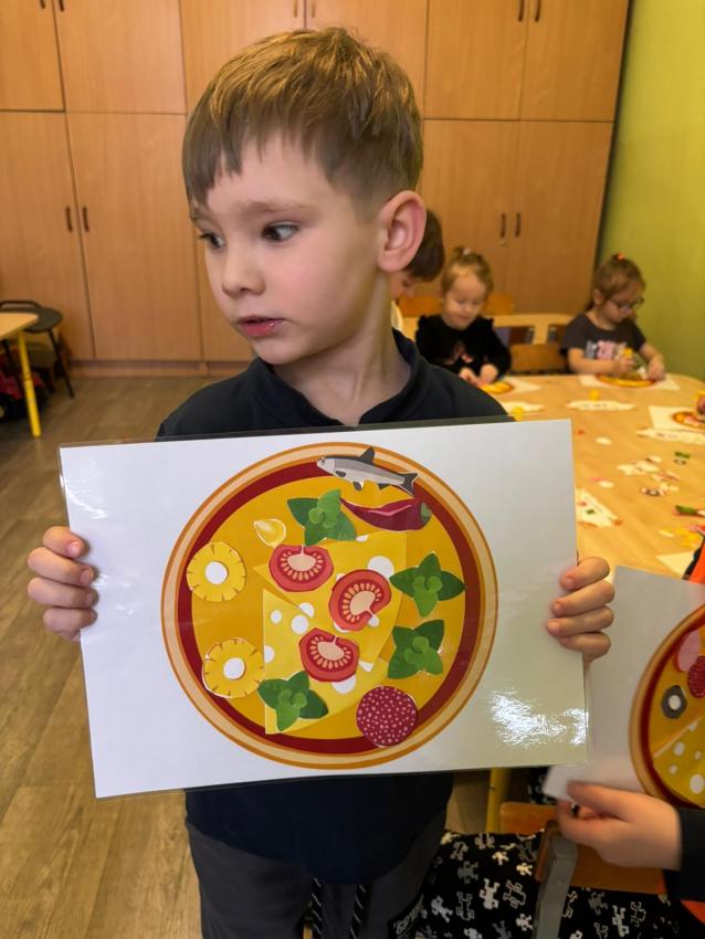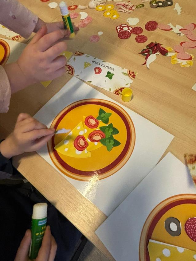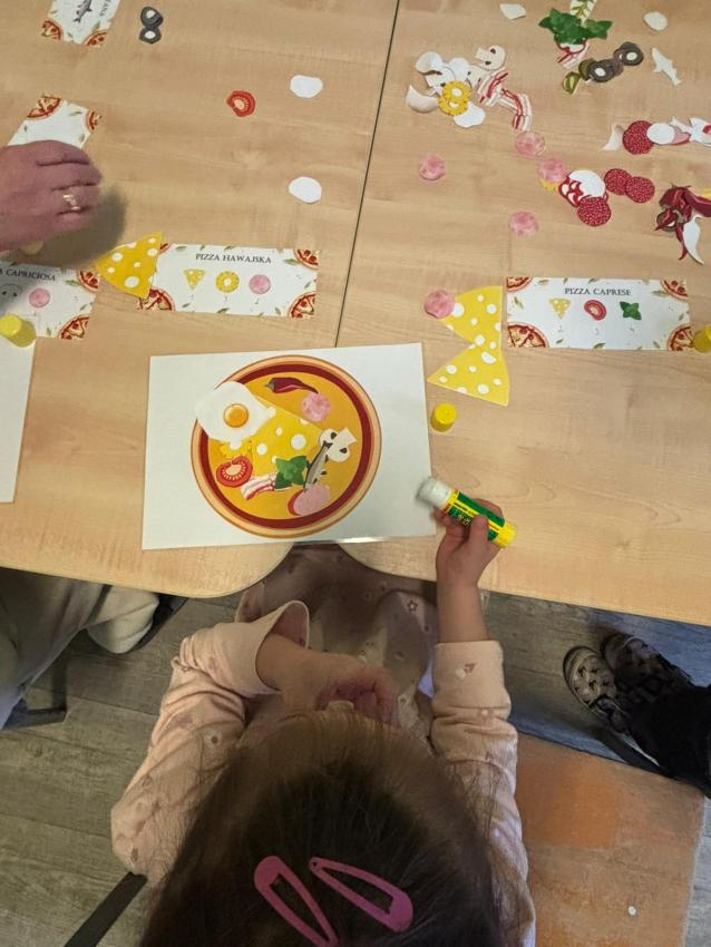 Na początku zajęć rozmawialiśmy o tym, jak powstaje pizza ? jak zrobić ciasto oraz jakich składników użyć, aby była smaczna i kolorowa. Następnie, zgodnie z otrzymanym ?zamówieniem?, dzieci odwzorowywały odpowiednią ilość wybranych dodatków. W drugiej części mogły już same zdecydować, co znajdzie się na ich pizzy ? pojawiły się ulubione składniki i bardzo ciekawe, kreatywne pomysły