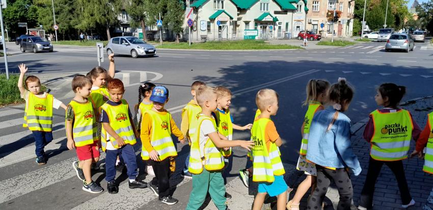 Przedszkolaki z grupy Żyrafki udały się na pobliskie skrzyżowanie aby przypomnieć sobie podstawowe zasady bezpieczeństwa w ruchu drogowym. Wyposażeni w odblaski przechodziliśmy przez ulicę, rozpoznawaliśmy znaki drogowe. Nasze obserwacje przenieśliśmy wykonując pracę plastyczną " Znaki drogowe"