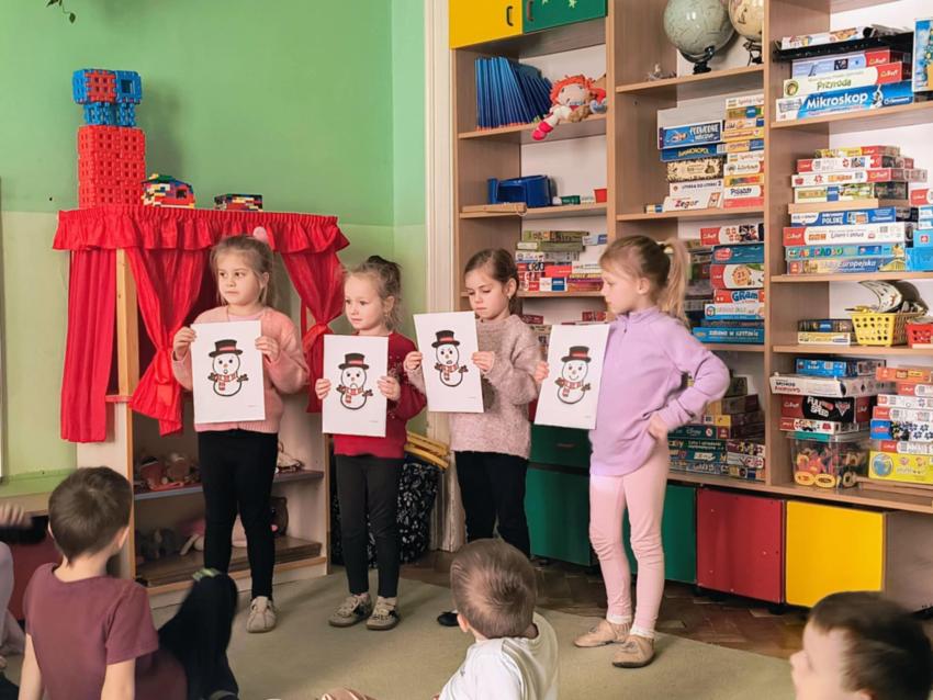 W oddziale III odbyły się zajęcia koleżeńskie " Śniegowy kolega". W trakcie zajęć dzieci kształtowały umiejętność współpracy i współdziałania, rozwijały wyobraźnię i pobudzały twórczą aktywność - przeliczały, klasyfikowały, poruszały się na podstawie instrukcji słownej, określały emocje. Łączyły wrażenia ruchowe, słuchowe i wzrokowe.